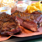 Der stetige Blick auf die bedruckten Platzsets und das Knurren meines Magens zwangen uns dann doch den Bestellvorgang selbst in die Hand zu nehmen. Der gute Shaneymac hatte schon im Vorfeld mit dem Pitmaster konspiriert und sich auf die Beef Short Ribs eingeschossen. Auch die sagenhafte, 10 kleine Schälchen beinhaltende Dip-Line, bei der Dirk Vieth sein komplettes Saucenprogramm auf einer Holzleiste präsentiert, war gesetzt. Auch an der „Mixed Plate“ (9,50 Euro), einem wohlfrittierten Sortiment aus Appetizern, bestehend aus Chicken Wings, Mozzarella Sticks, Onion Rings etc., kamen wir nicht vorbei. Beide Parteien schienen ordentlich Hunger mitgebracht zu haben, was die zweifache Bestellung dieser Fingerfood-Palette vorweg bedeutete.