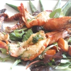 Grillplatte mit Oktopus, Jakobsmuschel, Garnelen, Calamaretti, Okraschoten und einem Wildkräutersalat mit Süßkartoffelcroutons