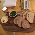 Wir nahmen an unserem Tisch Platz und die Karten wurden gereicht. Erfreulich, die Karte ist kurz! 20 Gerichte insgesamt, dass war es. Bei dem Umfang sollte eine frische Küche machbar sein, ohne allzu viel Conviniencezutaten. Besonderheit ist, dass man bei den Hauptgerichten seine Beilagen auswählen kann. Die Auswahl der Tischgenossen war dem Service recht schnell übermittelt. Nach der Bestellung ein kleiner Küchengruß in Form von selbstgebackenem Brot mit Butter und einem Pesto.