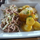 Wir entschieden uns für einen Salatteller mit Bratkartoffeln und 2 Spiegeleiern (10,90 €), Wurstsalat mit Bratkartoffeln (7,50 €) und Pommes mit Ketchup für die Kleine.