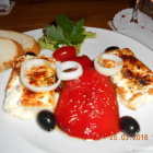 Als Vorspeise wählten wir Beide den gebackenen Schafskäse mit Zwiebelringen,gebackene Paprikaschoten,Oliven und Baguette zu je 7,50 Euro. Wir waren uns einig. Die volle Punktzahl. Es war schön angerichtet und schmeckte hervorragend. Es waren schwarze,entsteinte Oliven. Die mögen wir eh lieber,als die grünen. Paprika war rot und grün.