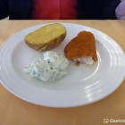 Die mediterrane Hähnchenpfanne sah nicht nur lecker aus, sie schmeckte auch so. Zartes Hühnerfleisch mit mediterranem Gemüse (Zucchini, Paprika, Oliven, Auberginen) in einer schmackhaften Tomatensoße. Pikant gewürzt mit Kräutern, Paprikapulver und einer Prise Chili. Als Beilage fungierten ein paar Kroketten und eine halbe Salzkartoffel mit Sour-Creme. Die Kartoffel war herrlich aromatisch im Geschmack und eindeutig ein regionales Produkt. Die Sour-Creme war mit frischem Schnittlauch verfeinert.