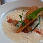 Auf einen Aperitif hatten wir verzichtet, so dass wir schnell mit drei hausgebackenen Brotrollen erfreut wurden. Meiner Frau hat die würzige Sardellenrolle am besten geschmeckt, mir die Version mit Walnüssen. Aber auch die Variante Tomate/Olivenöl stand kaum nach. Dazu Butter und Fleur de sel aus einem Weckglas, das erst aus der Küche kam. Beim Vorgänger stand es noch unabgedeckt im Gastraum, was ich nicht ideal fand. Derart lecker eingestimmt erwarteten wir den Salat, als unser Gastgeber als weiteren Gruß ebenfalls im kleinen Weckglas ein geeistes Fenchelrahmsüppchen servierte. Auf dem Deckel setzten ein Stück Garnele und geröstete rote und gelbe Paprika hübsche farbige und später geschmackliche Akzente. Optisch schön mal beeindruckend. Auch ein Kräutlein war dabei. Aber da ich bei diesem Besuch charmanteste Begleitung hatte, war meine Aufmerksamkeit abgelenkt, so dass ich nur noch sehr kursorisch berichten kann... Eventuell kann die Community anhand des Fotos botanische Hilfestellung geben. Das Süppchen war übrigens sehr sahnig, was mich etwas mit dem Fenchel versöhnte, der eigentlich zu meinen kulinarischen Nein-Danke gehört. Die Paprika schmackig, die Garnele hat nicht gestört.
