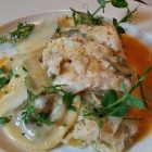 Da mein Hauptgericht einige Zeit zur frischen Zubereitung brauchte, bot mir Herr Karnaczewicz an, den Gurkensalat als Zwischengericht zu servieren. Auch hier wurde ein einfacher Teller kreativ veredelt, ganz ohne teure Gimmicks. Die knackigen Gurken waren mit gerade genug feiner Senfsauce überzogen, um noch selbst geschmacklich zu bestehen. Außer erwartbarem Dill und Petersilie, vervollständigte hier Kerbel die wohlbedachten Komponenten. Macht Spaß, den Überlegungen des Chefs nachzuschmecken, besonders, wenn sie so exakt auf den Teller gebracht werden.