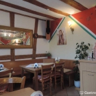 Im Inneren hat sich wenig geändert. Die sichtbaren Holzbalken an Decke und Wand kenne ich noch aus „Schleusenzeiten“. Die für ein Speiselokal von der Größe (geschätzte 30 Plätze) etwas überdimensionierte Theke aus hellem Holz stellt nach wie vor das zentrale Element des Gastraumes dar. Die putzige Deko früherer Tage ist einer eher nüchternen Ausstattung der Tische gewichen. Vereinzelte Drucke auf Leinwand versuchen etwas Farbe ins Lokal zu bringen. Leider wurde auch der golden umrahmte Querspiegel für Werbezwecke („Montag: Nudel, Dienstag: Pizza,…usw.“) genutzt. Ein paar in sattem Italo-Rot bepinselte Wandbereiche wirken eher unpassend zur ansonsten recht rustikalen Einrichtung, die sich in Form von einfach gehaltenem, hellem Holzmobiliar ausdrückt.