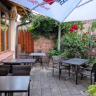 Freiliegende Fachwerkbalken, Boden in Holzdielenoptik und teilweise unverputzte Sandsteinwände schufen den Rahmen für ein äußerst gemütliches Weinstubenflair, das von rustikalem Holzmobiliar und geschmackvoller Dekoration adäquat verstärkt wurde.