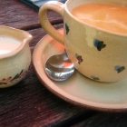 Im Haus ist die Keramik Manufaktur und dazwischen die Kuchenvitrine und die Kaffeemaschine. Man bekommt fast den Eindruck im Brennofen wird nicht nur glasiert sondern auch Gebacken. Alles sehr eng, originell, improvisiert und familiär.