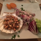 Fangen wir mit den Miesmuscheln an, dass waren die großen (grünen) pazifischen Miemsuscheln, dreimal so groß wie unsere aus der Nordsee, 6 Stück waren also eine ordentliche Portion. Diese waren gekocht, aber kalt serviert. Darauf ein Salat (Chalaca) aus Tomaten, Zwiebeln, Petersilie und Zitronenmarinade. Die leicht säuerliche Marinade passte perfekt zu den Muscheln. Sehr lecker! Störend die langweilige Salatbeilage, dass lenkte nur vom eigentlichen Gericht ab. Dann die Ceviche, die war hervorragend! Sauer-scharf! Deutliche Koriandernoten im perfekt frischen Fischfilet. Ich vermute, dass es Rotbarsch war. Das war wirklich lecker! Sogar die salzigen, krossen Maiskörner waren eine gute Ergänzung! Die Süßkartoffel wollte in meinem Geschmacksempfinden nicht recht dazu passen, aber sie störte den Genuss nicht weiter. Wir waren uns einig, das war ein guter Start mit interessanten neuen Gerichten, die wir so noch nicht kannten.