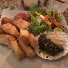 zuerst zum gegrillten Fischfilet. Bedeckt war es mit einer Sauce aus geschmorten roten Zwiebeln. Oliven und Ei obenauf, dazu wieder Süßkartoffel gekocht und Melone. Die Sauce mit den geschmorten Zwiebeln erschlug den Fisch ein wenig, von dessen Gütestufe bekam nichts mit. Die leicht süßliche, etwas scharfe Sauce an sich war äußerst schmackhaft! Hier passte dann die Süßkartoffel auch besser hin als Beilage! Guter Gang. Das geröstete Filet war in kleine Tranchen geschnitten, mehliert und dann gebraten worden. Gewürzt war es sehr zurückhaltend, der Fisch weißfleischig, vermutlich auch Rotbarsch. Die Aioli passte dann, noch besser die nicht angekündigte Oliventapenade, die war sehr lecker. Hier fand ich auch die Salatbeilage passender als bei der Hauptspeise. Nicht gut gefallen haben mir die gekochten (vermute ich), mehlierten und dann frittierten Stücke der Maniokwurzel. Das wird nicht meine liebste Sättigungsbeilage werden. Jede Supermarktkartoffel hat mehr Eigengeschmack als die die Wurzel. das muss aber jeder selber entscheiden, wie ihm diese schmeckt. Ansonsten beide Gerichte wieder mit neuen Eindrücken für uns Beide, und so möchte man es ja, wenn man eine unbekannte Küche ausprobiert.