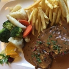 Mein Rumpsteak - von der Standardkarte - medium gebraten mit einer Pfeffersauce, die nicht nur Pfeffer im Namen hat und einem bissfestem Marktgemüse hat mir äußerst gut geschmeckt. Der Preis von EUR 21,50 ist fair.