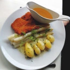 Nach passender Zeit war Herr Steiger wieder zugegen und meine Tochter konnte ihr Wiener Schnitzel mit Spargel neuen Kartoffeln (25.-) platzieren.