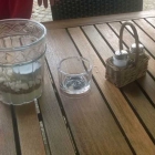 Angesichts der dargestellten Kernkompetenz ‘Tapas‘ brauchte es kaum noch Überzeugungskünste meinerseits und schon saßen wir an einem Tisch des Außenbereichs. Dessen Möblierung wurde weitestgehend übernommen, das bedeutet, die Klapptische weisen immer noch diese störenden Eisenstreben im Kniebereich auf. Bei der Bestuhlung hat man sich gegen die kleineren und schwereren aber zum Tischdesign passenden Klappstühle entschieden. Dafür gibt es jetzt leichtere und etwas bequemere Hochlehner aus Kunststoffgeflecht in Rattanoptik. Für einen größeren Ansturm wird allerdings noch die alte Bestuhlung vorgehalten. Üppig dimensionierte Großschirme mit Werbeaufdruck eines etablierten Altherstellers aus der Verbotenen Stadt schützen effektiv vor der eher spärlich scheinenden Sonne. Auf den Holzstreben-Tischen finden sich Wastelstreuer, eine Sukkulente und ein Teelicht, jeweils im kiesgefüllten Glas und ein gläserner Aschenbecher. Auf Wunsch kriegt man auch eine Pfeffermühle. Im Innenraum haben wir uns nicht umgesehen, gehen aber davon aus, dass sich wegen der Vorgaben des Denkmalschutzes dort nichts geändert haben dürfte. Wenn der erste Eindruck positiv ausfällt und der Pächter solange durchhält schauen wir ‘s uns im Winter nochmals an.
