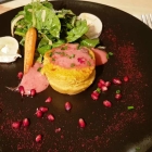Mein Heilbuttfilet, super saftig und zart, ruht auf dem glasierten Rhabarber. Die Kartoffelmuffins mit frischem Thymian gewürzt. Und die asiatische Hoisinsauce machte dieses Gericht zu einem Aromateller. Der Rhabarber als Gemüse, hatte ich vorher noch nie in dieser Form gegessen, war mit seiner Säure sehr ungewöhnlich. Mit der würzigen, aber leicht nussig-süßen Sauce perfekt. Die Portion sehr gut bemessen.