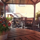 Wir nahmen an einem der schönen Außentische Platz, Sitzkissen wurden noch schnell für uns geholt. Alles ist sehr gepflegt und schön gestaltet. Frische Topfblumen auf den Tischen.