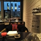 Auf angenehme Lautstärke gedimmte Technomusik empfing uns – der musikalische Kontrast zum Konzert hätte nicht größer sein können, aber man ist ja vielseitig empfänglich. Wir liefen an einer Theke vorbei, hinter der zwei Sushiköche ihrer Arbeit nachgingen, an der man aber leider nicht sitzen kann, um ihnen dabei zuzuschauen. Da hätte man sich die offene Küche eigentlich sparen und Hunden den Zutritt erlauben können.