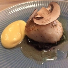 Mit der Ceviche von der bretonischen Makrele wird der Stil deutlich, der sich wie ein roter Faden auch durch das weitere Menü ziehen wird: wenige Zutaten, Fokus auf dem Hauptdarsteller und eine markante flüssige Begleitung. Die Makrele ist von sehr guter Qualität, die Vinaigrette wird bestimmt durch die Süße der schwarzen Walnuss. Als Schärfekick etwas frisch geriebener Meerrettich - mehr nicht. Klingt einfach? Ist es aber nur vermeintlich, denn vor allem die Vinaigrette beschäftigt mich lange. Ich meine, etwas wie Waldmeister oder Sauerampfer herauszuschmecken und liege damit falsch. Aber auch, wenn ich es nicht herausbekomme: diese Vinaigrette ist überraschend, ungewöhnlich und sehr passend.