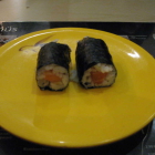 Mittlerweile ist die vorher erwähnte 4er Truppe fertig und wir haben den Laden für uns alleine. Futterneid kann so also gar nicht erst aufkommen. Plexiglastürchen auf, und jedes Tellerchen mal unter die geschmackliche Lupe genommen. Die Auswahl besteht hauptsächlich aus Maki Rollen und Nigiri ; unterbrochen von Einzelsnacks, wie gebratenen Nudeln, Garnele mit Sauce, Suppe im Becher, Schälchen Reis, gebackene Banane usw. Das hier alles im Einzelnen zu bewerten würde den Rahmen sprengen. Zusammenfassend: Sushi – durchaus gut gemacht und akzeptabel frisch zubereitet. Geschmackliche Anpassungen konnten durch die beigestellten Soja Sauce, Wasabi, süß-saure Asia Chilli Sauce, und ein Gläschen eingelegten Ingwer eigenständig vorgenommen werden.