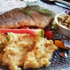 Das Steinbeißerfilet saftig gebraten, der Kartoffel-Meerrettichstampf sehr gut abgeschmeckt, reichlich buntes Pfannengemüse.
