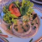 Egal, wir wurden sehr freundlich empfangen und wählten einen Tisch in Teichnähe. Die dunkel heraufziehenden Gewitterwolken ignorierend, orderten wir aus der vom Küchenchef Fabien Quirin (dem Namen nach Franzose bzw. Elsässer) klassisch regional angehauchten Speisenkarte ein paar „kleine Weinbegleiter“ vorweg. Schön, dass man hier auch sogenannte „Mini-Portionen“ von Pfälzer Klassikern – ganz in spanischer Tapas-Manier – bestellen kann. Wir entschieden uns für das Carpaccio vom Pfälzer Saumagen und die Blutwurst-Lasagne (beides in der Micro-Ausgabe für knappe 4 Euro zu haben). Die schmackhafte Winzer-Vinaigrette verlieh den dünnen Saumagenscheiben eine angenehme Würze. Die hausgemachte Pfalz-Lasagne schmeckte fabelhaft. Sie war mit Äpfeln gefüllt und lag auf delikatem Sauerkraut. Diese Kombination aus Blutwurst, Apfel und Kraut bildete ein herzhaftes Aromengewand mit angenehm süß-saurer Note. Dazu bissen wir in leckeres Bärlauchbutterbaguette (3,50 Euro) und waren rundum zufrieden. Auch die Portionsgrößen waren gut bemessen. Sie waren zwar als Miniaturen deklariert, hatten aber dennoch nichts mit mikroskopischen Happen gemein.