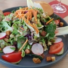 Frische Blattsalate, ergänzt mit frisch geraspelten Karotten, Salatgurke, Tomaten, Radieschen und Croutons wurde nach kurzer Wartezeit serviert. Das Dressing war klasse. Brot war in der Speisekarte nicht erwähnt, das halbierte Brötchen zum Salat war erfreulich.