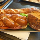 Meine Augen waren heute einmal wieder größer als der Magen. Ich hatte eine Laugen-Sesam-Stange mit Leberkäse (2,95 Euro). Tadellos gemacht mit Senf-Dressing, einem Salatblatt, Gurke und Tomate.
