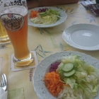 Bei der Essensbestellung musste ich an eine Bewertung, ich glaube von Nolux denken, als er Polla Polla bestellte und ich damals nicht wusste was das ist. Ich meine "halb und halb", ich wählte Polla Polla meine Frau nahm die Cevapcici. Nach knapp 5 Minuten kamen die Getränke, ratz fatz, so muss das im Biergarten sein. Die Bierchen sehr gut gekühlt,mein Waisels entpuppte sich als ein Krombacher Weizen, aber egal, schöne Trübung, sehr guter Geschmack. Danach wurden uns die Salate serviert, der war wunderbar lediglich mit Essig und Öl, Salz und Pfeffer angemacht. Gelber Blattsalat, Karotten, Blaukraut und Weißkraut. Sehr gut.