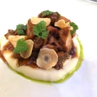 Kaninchen zart geschmort in einer konzentriert eingekochten dunklen Fleischsauce auf einem dicken Bett von Kerbelwurzelpüree. Kerbel hielt sich geschmacklich dezent zurück. Schließlich war das köstliche Fleisch mit seiner üppigen Sauce der Hauptdarsteller auf diesem Teller. Nur einige leicht knusprige Kerbelscheibchen wagten sich als Deko auf das Kaninchen. So muss Kaninchen schmecken!