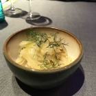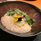 Zwei Stückchen von mariniertem Fisch und ein Raviolo, der mit zerkleinertem Fisch gefüllt war, schwammen in einem kalten Gurkensud, sowie kleine durch Molekularküche entstandenen Perlen, die beim Aufnehmen im Gaumen platzten und eine wunderbare erfrischende Geschmacksexplosion erzeugten. Diese Komposition fanden wir optisch und geschmacklich toll !