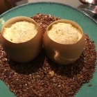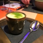 Als Amuse Bouche wurde in einer braunen Keramikschale ein Erbsenpüree mit Sous vide gegarten Erbsen, Eigelb, einer Mimmolette, gerösteten Brotchips und einem Erbsensud serviert. Optisch sehr ansprechend und auch hier eine wahre Gaumenfreude