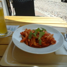 Fazit: Die Pasta war jetzt nicht ganz so schlecht (trotz unterschiedlichen Temperaturen), obwohl ich mir unter der angebotenen "Würzigen Tomatensauce" etwas anderes vorgestellt hatte als eine "Fruchtige Tomatensauce" ohne Pepp. Man kann dort schön draußen unter den Sonnenschirmen sitzen und wenn man wie ich, einen dieser zweier Ecktische nimmt, hat man entweder von der Wasserseite oder ansonsten von der Marktplatz Seite immer etwas zügige Luft, was bei den Temperaturen nicht schlecht war.