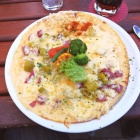 Zwiebelpfannkuchen mit Speck, Sauerrahm und Käse (8,40)