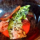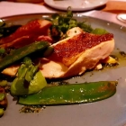 Schließlich ein Happen geflämmter Lachs mit ebenfalls „befeuertem“ Romanasalat in einer natürlich optisch reizvollen Paprikasauce. Die Kombi nordischer Fisch mit mediterranem Gemüse hatte für mich aber schon im Berliner Savu nicht funktioniert. Auch jetzt gefiel mir der Klacks Trüffelmajonäse besser zum Lachs.
