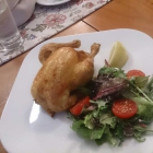 Kleiner Gockel frisch aus dem Ofen mit Zitrone, Blattsalaten und Brot (12,50€)