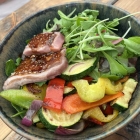 Frau bekam ihre Hauptspeise, sie hatte sich eine Bowl bestellt. Sashimi-Bowl, ergo marktfrischer Mix aus Rucola, gezupftem Babyspinat und Blattsalat mit gegrillter Paprika, Zucchini und Streifen vom gegrillten Sashimi-Thunfischsteak in einer Teriyaki-Sesam-Mischung, dazu Granatapfel-Melonen-Dressing. Gargrad für den Fisch war vorher mit medium abgefragt worden und wurde perfekt getroffen. Frau kam noch mal in den Genuss dieser sehr feinen Teriyaki-Sesam-Sauce. Die allerliebste aller Ehefrauen äußerte sich sehr zufrieden zu ihrer Salatschüssel. Für mich was vom Grill, nämlich Thunfisch.