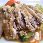 Die Mini-Rollen waren selbstgemacht und hätten für mich ruhig stärker gewürzt sein können; sie haben geschmeckt. Geschmeckt hat auch die Ente, meiner Frau allerdings mehr als mir. Sie (die Ente) war Gottseidank nicht wie in vielen Asia-Betrieben "durcher als durch", hatte allerdings das Stadium "rosa gebraten" leider um zwei oder drei Minuten hinter sich gelassen; an wenigen Tranchen war bei ganz genauem Hinsehen noch ein minimaler Rosaschimmer zu erkennen. Schade, aber so reicht es nicht zu vier Sternen; immerhin gibt es drei.