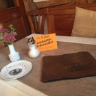 Es ist ein altes Haus mit vielen Dekoelementen. Man kann hier Stofftiere, Hausschuhe und alles mögliche käuflich erwerben. Alles irgendwie kunterbunt zusammen gewürfelt. Auf dem Tisch liegt die Karte, es gibt ein frisches Blümelchen, einen Aufsteller mit Federweiser, einen Zuckerstreuer und einen Teller mit verpackten Süßstoff. Hier denken wir solle noch ein Milchkännchen mit drauf stehen.