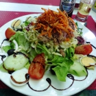 Unsere Salate werden recht flott serviert. Etwas grobmotorisch zerteilt, aber frisch und gut. Die Balsamico-Creme-Deko muss wohl immer noch sein. Dazu ofenwarmes frisches Baguette im separaten Körbchen. Gutes Olivenöl, Balsamico, Salz und Pfeffer. Öl und Essig überzeugen durch gute Qualität.