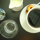 Hier kann man sehr fein pausieren und sich vom Museumsbesuch erholen. Die Speisekarte bietet einen wechselnden Mittagstisch für 9,50 Euro (zuweilen auch Vegetarisches, auf jeden Fall immer auch regionale und saisonale Köstlichkeiten, so wie momentan z.B. Kürbisgerichte), Salate, Quiches, Snacks und natürlich hervorragenden Kaffee und Kuchen. Letzteres ist in einer Glasvitrine vor dem Bestellen zu Begutachten. Ich habe eine Haferl Kaffee für 3,50 Euro gewählt – gut, wenn man einen etwas größeren Kaffeedurst hat. Kräftig und aromatisch war er . Und besonders gefreut habe ich mich über die Tatsache, dass eine kleine Karaffe mit ausreichend Milch ungefragt dazu serviert wird. Sonst stört mich oft, dass nur eine kleine abgepackte Portionsgröße Kondensmilch gereicht wird und ich evtl. mehrfach um Nachschub bitten muss. Zum Kaffee hatte ich das leckere Monaco-Mineralwasser mit Kohlensäure - in blau gestylter Flasche, die selbst schon ein Design-Eyecatcher ist (2,80 Euro für 0,33 Liter). Und hinterher noch ein kleines Bitter Lemon für 2,90 Euro.