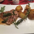 Der Hauptgang Scalopina (feines Kalbschnitzel) in Salbeibutter und Rosmarinkartoffeln, genauso wie ich es mag, mit Salbei, frischem Thymian und Rosmarinzweig.