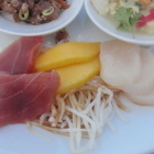 Mein Spargelsalat mit Ponzulachs und gestocktem Ei (nun gut, man hätte es auch hart gekocht nennen können) ist da deutlich abwechslungsreicher und aromatischer. Zuvor allerdings muss man einiges an rohem, leider nicht angemachten Grünzeug beiseite räumen, das zwar sauber in lange, dünne Streifen geschnitten ist, dadurch aber eben nicht essfreundlicher wird. Der Spargelsalat in cremigem Dressing indes schmeckt sehr gut, der Lachs weist durch das Marinieren mit Ponzu eine erfreulich feste Konsistenz und eine dunklere Farbe auf, ist ebenfalls lecker.