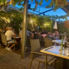 Bei unserer Ankunft begrüßt uns eine recht junge Dame an einem im Restauranteingang provisorisch aufgestellten Pult, von wo der Gast zum Tisch begleitet wird – offensichtlich ein Tribut an die Corona-Situation. Hier fällt uns schon das agile Damenteam auf, das zahlenmäßig ein Handballteam bilden könnte und die Liaison zwischen Küche, Ausschank und Gästen bildet. Die junge Dame begleitet uns zu einem Zweiertisch im ständig überdachten Teil der Terrasse. Wir nehmen Platz und fühlen uns auf der reichlich begrünten Piazza mit Brunnen prompt sehr wohl.