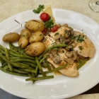 Der Italien-Klassiker zeigt sich hier in einer außergewöhnlichen Fisch-Variante: Zwei Doradenfilets sind mit den üblichen Salbeiblättern belegt und haben eine Haube aus geräuchertem Lachsfilet erhalten. Vervollkommnet mit einer würzigen Weißweinsauce mundet diese Komposition meiner Angetrauten mal wieder ausgezeichnet. Auch die Beilagen – Rosmarinkartoffeln und Spinat wie bei meinem Gericht – lassen nichts zu wünschen übrig.