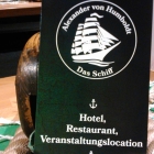 Wir hatten schon an der Schlachte gegessen und bummelten am Kai entlang. Es war schon nach 23.00 Uhr und wir dachten, dass dort schon geschlossen ist. Auf Nachfrage erklärte man uns, dass die Bar des Schiffes bis 24.00 Uhr geöffnet ist. So bestellten wir uns einen Weißwein ubnd schauten uns um. Auf den glatten Holztischen stand die Karte in einem gedrehten Tau und natürlich geht die ganze Deko im Innenraum in die maritime Richtung. Aufpassen muss man beim eintreten, denn dort ist eine hohe Schwelle.
