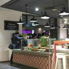 Die Herren hinter der Theke trugen alle einheitliche grüne T-Shirts mit Logo drauf. Man stellt sich dann an die Glasfront wo sich auch die Kasse befindet und wartet bis jemand was sagt.