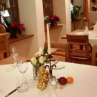 Wir hatten einen Tisch für zwei Personen reserviert und entschieden uns im Innenraum Platz zu nehmen. Die Begrüßung war freundlich und uns wurde ein Vierertisch im hinteren Bereich des Gastraumes angeboten, zu dem uns der mit dunkler Hose und weißem Hemd bekleidete Kellner brachte. Ein heller Holzparkettboden, Stühle bzw. Wandbänke und Tische in Eiche hell bestimmen das Mobiliar im Gastraum, die Wände in einem hellen Cremeton gestrichen. Die Tische sind mit einer hellen Tischdecke, Besteck, Stoffservietten, Wein- und Wassergläsern, einer frischen Blume in der Glasvase und einem Kerzenständer eingedeckt. Sowohl im Inneren als auch Außen herrscht ein Wohlfühlambiente, damit auch 4****.