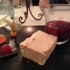 Zum Geschmack: Die Jakobsmuscheln sehr gut gebraten, schön aromatisch die Beete. Im Eingangsbereich lag der aufgeschlagene „Feinschmecker“ mit dem Trüffelthema. Leider ließ sich das Trüffelaroma bei dieser Vorspeise nur schwer finden. Das Kürbis-Risotto, wohl lange vorbereitet, daher eher ein Pürree. Keine schlechte, aber eine verbesserungswürdige Vorspeise.