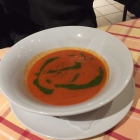 Tomatensuppe – Die Suppe war schön heiß , hatte eine leichte cremige Konsistenz und schmeckte richtig gut nach Tomaten. Vom würzen her musste sie sich auch nicht verstecken, oben drüber gab es noch etwas frisch gemahlenen Pfeffer. Als Einlage wurde hier nicht nur der Basilikum rein gelegt, sondern es gab ein Basilikum-Pesto. Dieses war sehr geschmackvoll und passte wunderbar zur Suppe dazu.