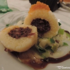 Zur kulinarischen Einstimmung ein kleiner Aperitif vorneweg. Leider war der Aperitif „à la pêche de vigne“ (Sekt mit Likör vom Weinbergpfirsich für 5,20 Euro) aufgrund des gerade ausgegangenen Pfirsichlikörs nicht zu haben, aber der fruchtig-prickelnde Holunderblütenzauber (auch 5,20 Euro) bot adäquaten Ersatz. Schon schön, wenn ein Lokal mit einer wohlsortierten Aperitif-Karte aufwarten kann, denn gerade für den Einstieg ins Mahl hat ja jeder so seine Vorlieben. Dann grüßte die Küche mit einer „Pfälzer Mozartkugel“, ein kleiner Kartoffelknödel mit Blutwurstfüllung auf Lauchgemüse. Super Idee und toller Einstieg zugleich!