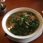 Die Suppe war eine ordentliche Schüssel voll mit schmackhafter , würziger Rinderbrühe. Da war kein Pülverchen dran und sie war sehr lecker. Eine ganze Ladung Reisnudeln befanden sich darin und diese waren auf den Punkt gegart. Die Rindfleischstreifen super saftig und zart allerdings ungewürzt. Wenn man sie dann zusammen mit brühe gegessen hat passte es dann schon. Es gab noch knackigen , etwas weich gekochten frischen Spinat mit dazu. Oben drüber gesellten sich noch frische Frühlingszwiebeln mit dazu und frischer Koriander. Hier scheiden sich ja die Geschmäcker gewaltig. Ich mag ihn nicht und Spotzl liebt ihn. Also schnell die Suppe zu Spotzl gereicht dass er ihn runterfischt. Die Suppe war auch sehr schön heiß so das man auch zum Schluss noch etwas wärme beim Essen hatte.