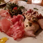 Dafür bekommt man eine Mischung aus Meer, Weide und Acker. Am besten gefiel mir die längs halbierte grobe Bratwurst (Salsiccia) mit Fenchelaroma (meinten wir am Tisch herausgeschmeckt zu haben). Gut auch die Grünschalenmuscheln und der Fenchel von der Gemüsefraktion. Die übrigen Mitspieler (Lachs, Salami, Bresaola, Auberginen, Zucchini, Caprese) waren ordentlich, lösten aber keine Ahaerlebnisse aus. Ich vermisste marinierte Funghi und Oktopus oder Calamaretti. Aber insgesamt ordentliche Antipasti und der Preis war noch akzeptabel.